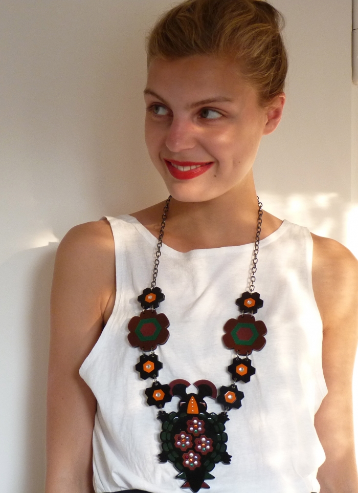 Künftig darf ich mich mit diesem herrlichen Kunstwerk schmücken: Die “Armadillo“-Halskette stammt aus der Schmiede des spanischen Illustrators und Designers Gonzalo Cutrina und tut genau das, was ein ordentliches Schmuckstück zu tun hat: Sie fällt auf. Kombiniert zum schlichten weißen T-Shirt sorgt sie allerorts für Furore, auch wenn das zentral angebrachte, große, mit glitzernden Plastiksteinen besetzte Ungetüm oftmals fälschlicherweise für einen Käfer gehalten wird – nein, es ist ein Armadillo, ein Gürteltier!