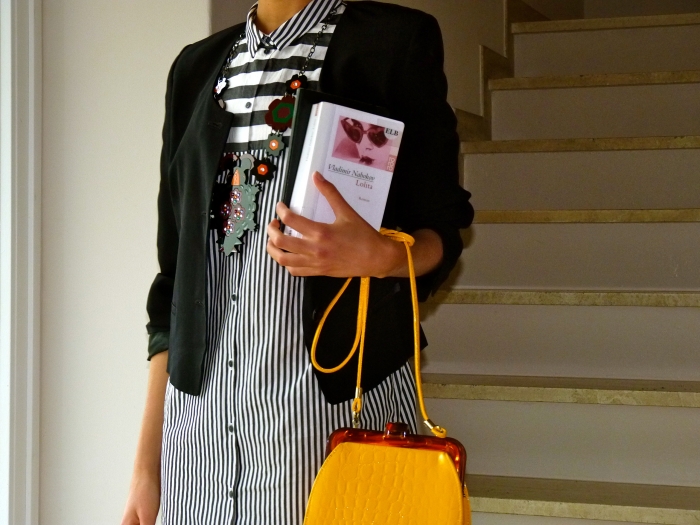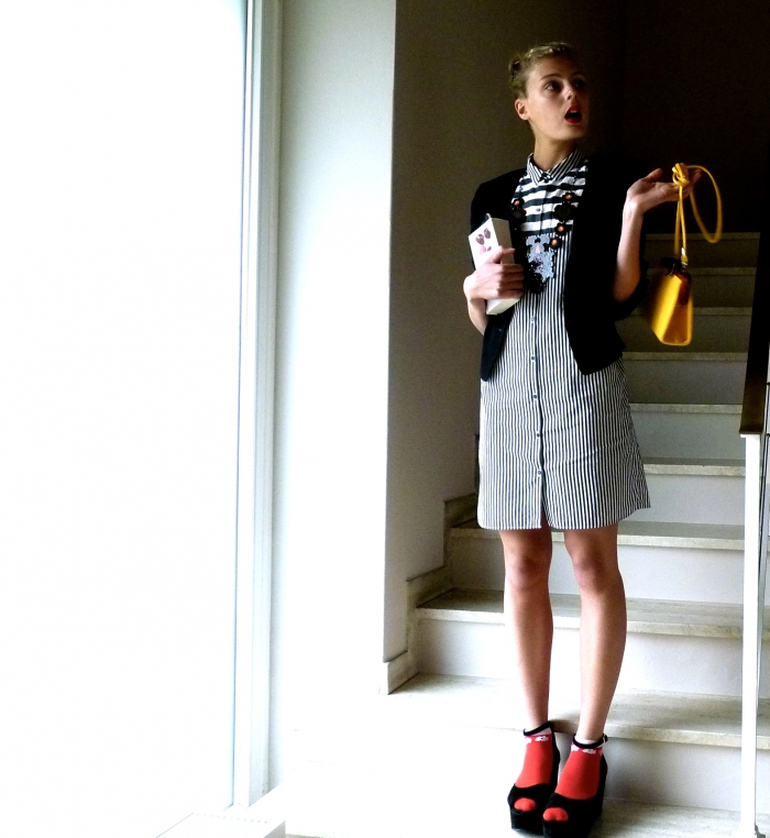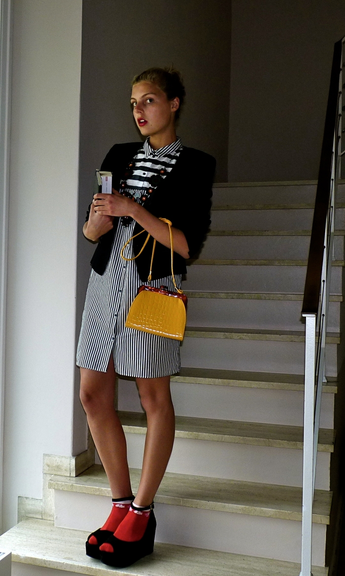 Hier sieht man mich nun, mit angestrengt koketter Mimik, im albernen und zugleich wahrhaft spaßigen Streifen-Klimbim-Firlefanz-Schnickschnack-Look. Nun ja, vielleicht könnten hie und da noch ein Schwall Armreifen, ein knallbunt gemusterter Mini-Wollpullover, Hut, rosa Pelzstola und vier weitere Handtaschen ergänzt werden. Aber für den Anfang sollten das Kleid von