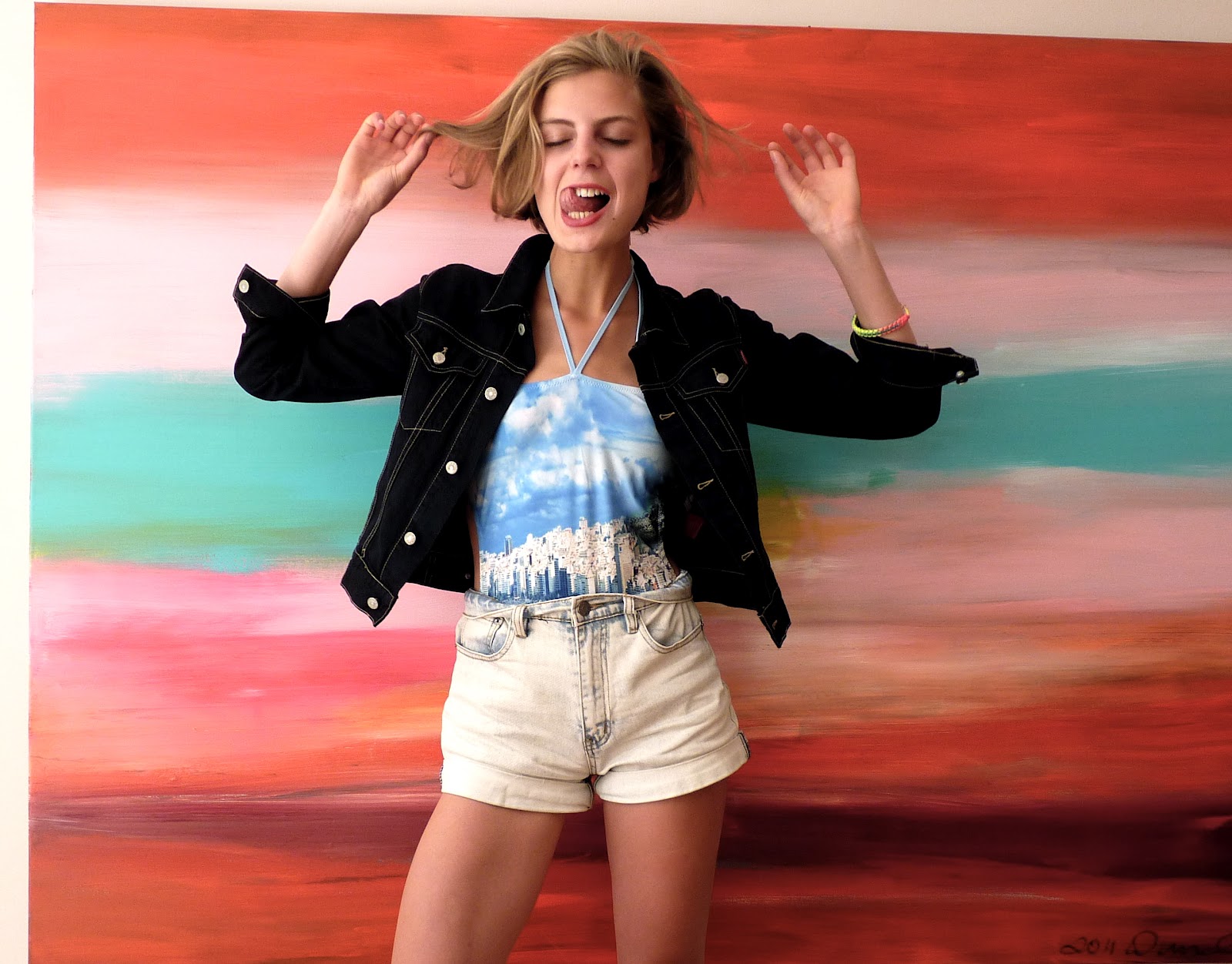 Ich trage Shorts von Weekday, einen Badeanzug von Topshop und ein selbstgemachtes Armband (die DIY-Anleitung dazu findet sich hier). Im Hintergrund sehen wir ein Kunstwerk von Noah Wunsch.