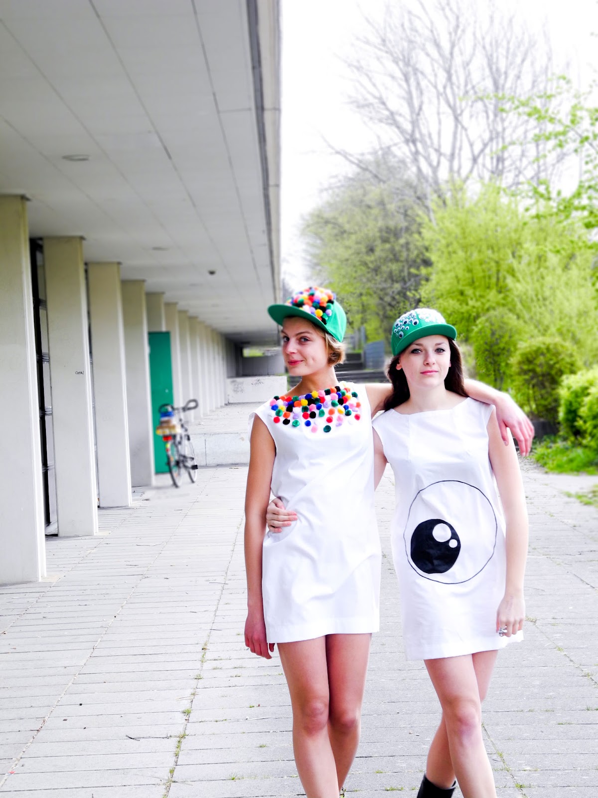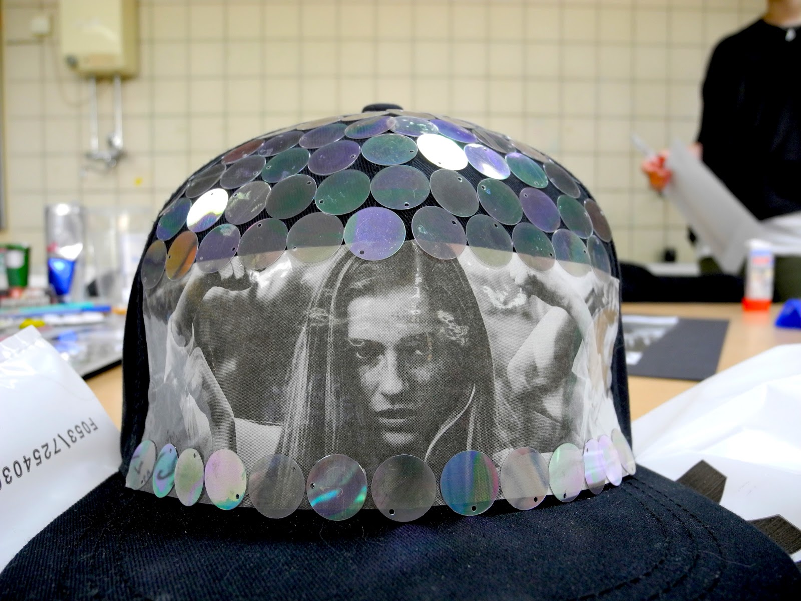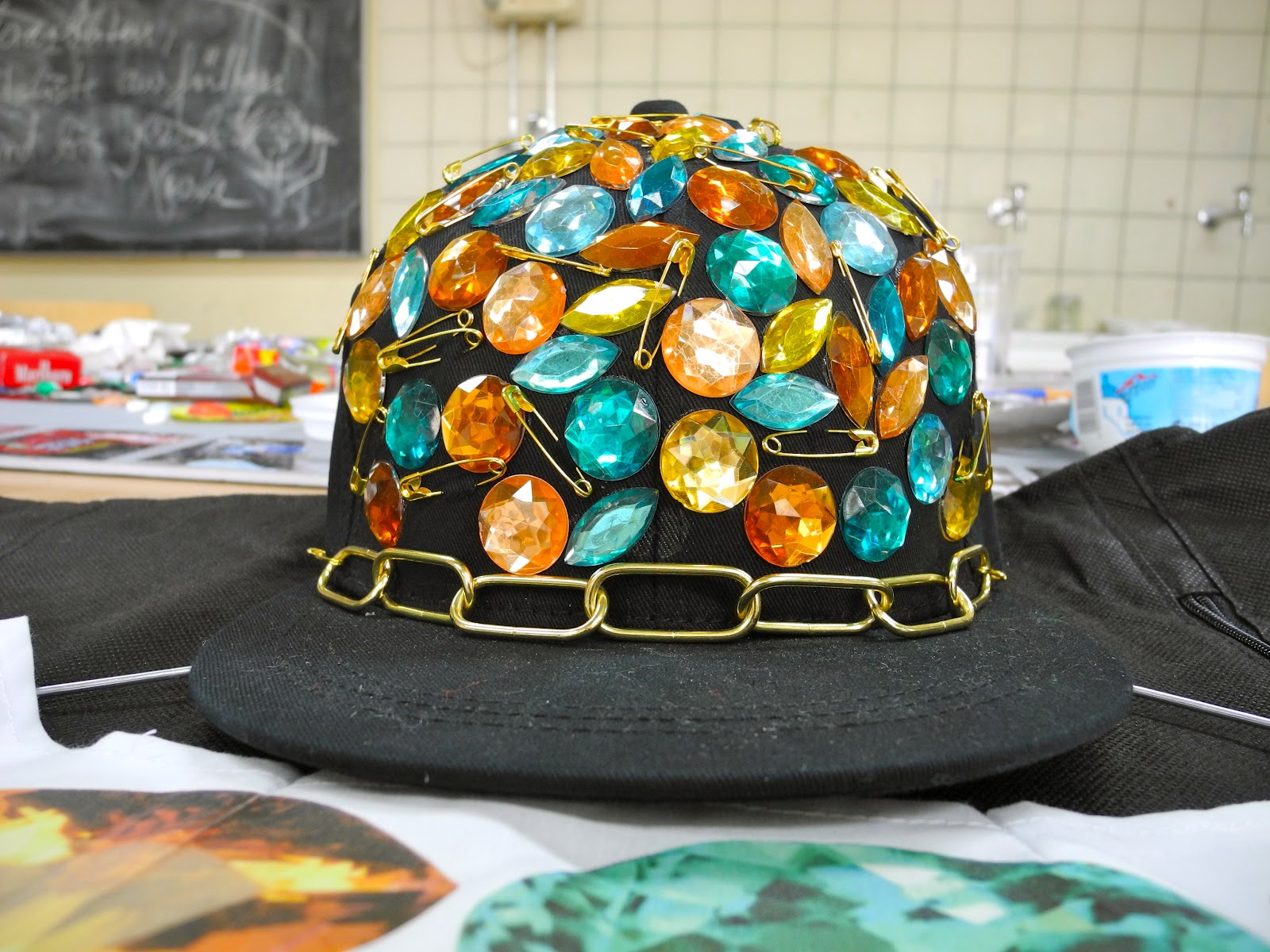 Und nun möchte ich von meinem Kunstprojekt erzählen. Inspiriert von dem omnipräsenten Captrend, der Liaison dieses eigentlich eher prolligen Kleidungsstücks mit modischer Raffinesse, und den zahlreichen Gestaltungsmöglichkeiten, die die Cap tatsächlich bieten kann, entstand in Kooperation mit meiner liebsten Kumpeline Mira das Projekt „Großstadtcouture“. Dass natürlich auch der großartige Cap-Künstler Deryck Todd großen Einfluss auf unsere Arbeit hatte, sei an dieser Stelle treuherzig verraten. Allerdings erfolgte der entscheidende eigene Input durch die Ergänzung jedes Cap-Modells, das wir entwarfen, um ein entsprechendes Kleid, als Verkörperung der neuartigen Symbiose von Streetwear und Couture. Die insgesamt achtteilige Kollektion besteht aus jeweils vier Kappen und vier Kleidern – jeweils inspiriert durch ein besonders Element, einen bezeichnenden Aspekt der Großstadt. Da hätten wir nun also die mit Kulleraugen bestückte Cap plus Kleid unter dem Titel „The city is watching you“, in Anlehnung an die Überwachung durch Kameras und Millionen von Augenpaaren, der wir Großstadtmenschen permanent ausgesetzt sind. Das „Big-city-lights“-Modell, übersät von knallbunten flauschigen Pompoms, steht für die üppige Farbigkeit der großen Metropole, während die „Ghettoglamour“-Cap in Kombination mit dem entsprechenden Kleid den Kontrast zwischen rauem Ghettoalltag (daher die Sicherheitsnadeln) und glitzerndem Großstadtglamour (daher die Schmucksteine) symbolisieren soll. Die mit schillenderen Pailletten gestaltete Kappe, kombiniert zum Kleid mit Schallplattenspieleraufdruck, ist hingegen schlicht und ergreifend ein Ausdruck des wahnsinnigen Vergnügens, dass eine Partynacht in der Großstadt mit sich ziehen kann.