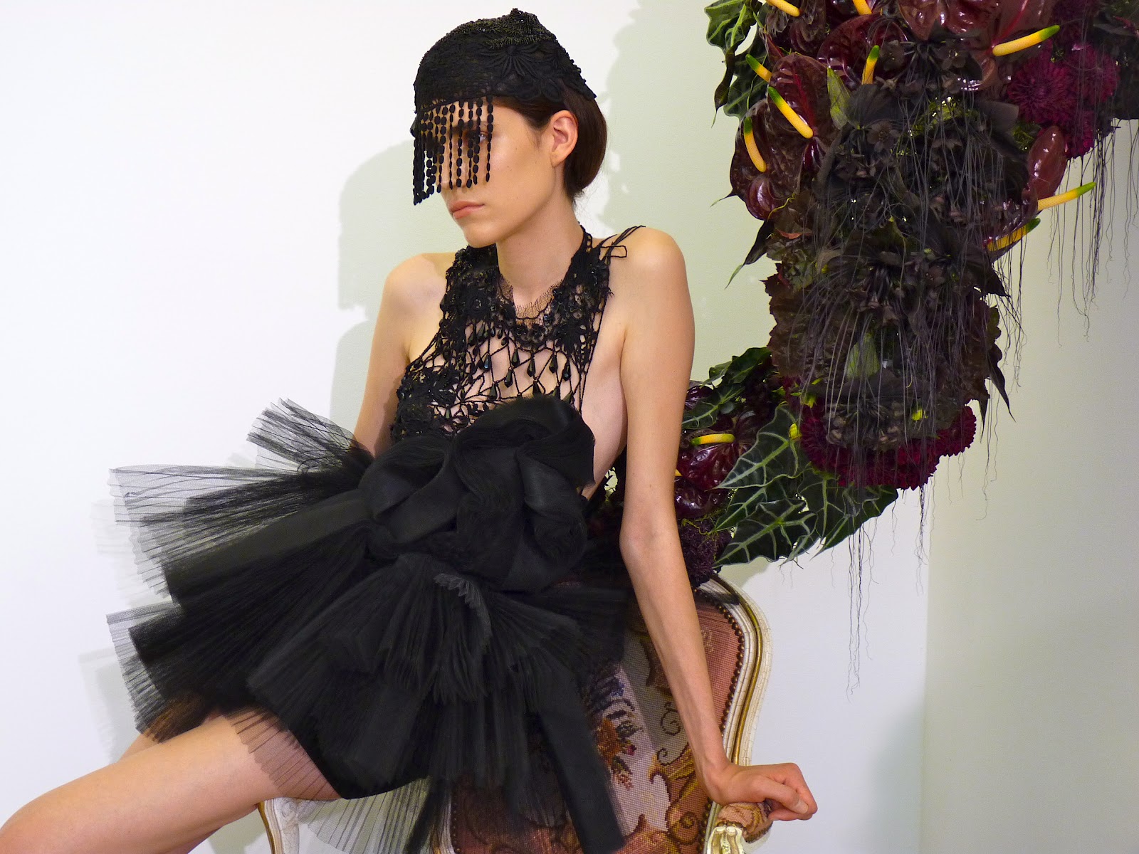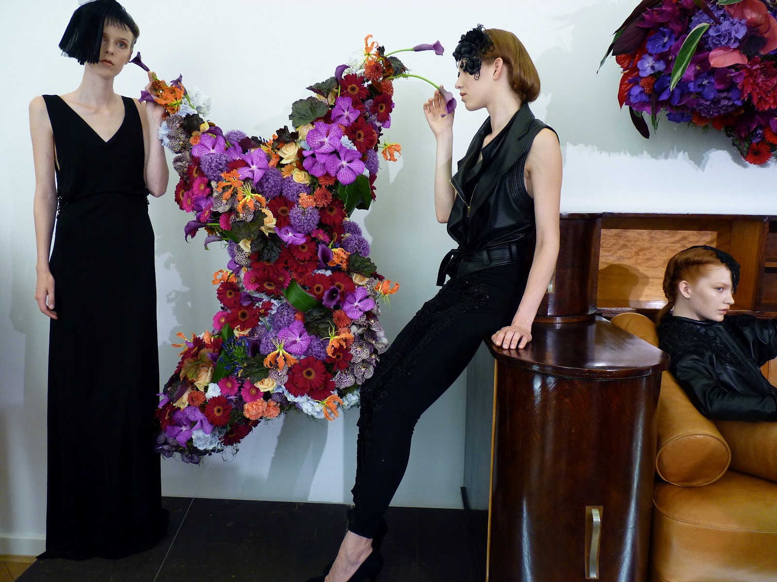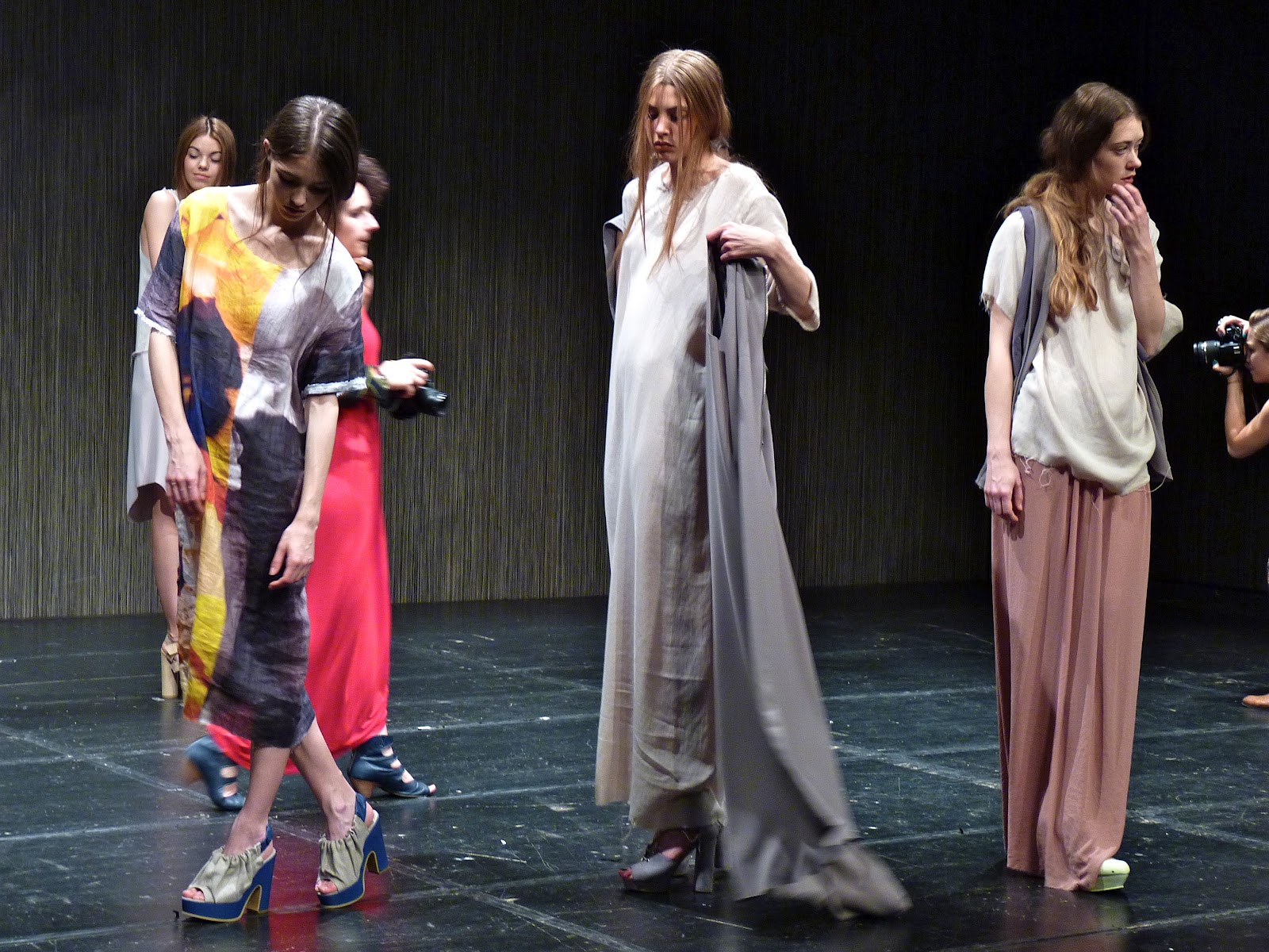 Was haben wir nicht alles an traumhafter Kleidung in den letzten 24 Stunden bewundern dürfen! 70ies-Glamour, lässige weiße Hosenanzüge und Schlapphüte sowie Streifen in fruchtigen Sorbetfarben bei Escada Sport; melancholisch-düstere Looks aus schwarzer Häkelspitze und plissierter Seide, traumhaft schön in Szene gesetzt mit üppigen Blumenkunstwerken, bei Augustin Teboul; fließende Kleider in Taupe und Nude sowie abstrakte Blumenprints bei Vladimir Karaleev; ein Feuerwerk an futuristischen und teils farbgewaltigen Entwürfen, gezeigt von den fünf Finalisten beim „Designer for tomorrow“ Award; überdimensionierte Strickmäntel und fuchsbraune Lederkokons von Leandro Cano, dem Gewinner des hochkarätigen Preises, den Marc Jacobs verlieh; und schließlich, was für ein wunderbarer Abschluss des gestrigen Tages, edelste Couture bei Kaviar Gauche: mit Lasercut gestanztes weißes Leder, dem dadurch ein eleganter Lochspitze-Effekt anhaftet, subtil transparente, fließende, teils plissierte Seide in Schwarz oder Gold, und ein üppiger, zitronengelber Traum von einer Abendrobe – in diesem Aufzug würde ich durchaus zum Traualtar schreiten.